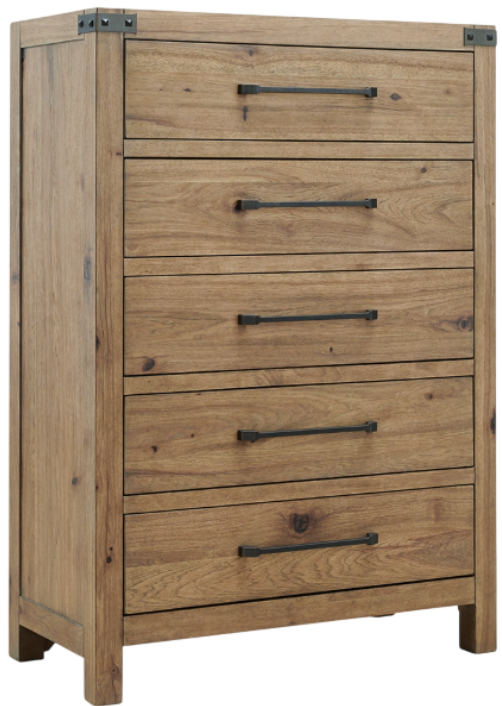Rustic character with a dash of refinement. Outfitted with stunning hickory veneer and completed with a natural finish, this chest of drawers celebrates the authentic beauty of wood. Its sturdy silhouette, complete with a thick top and posts, lends a substantial, luxurious weight to the look. Metal accents introduce an industrial-inspired flair.Read More