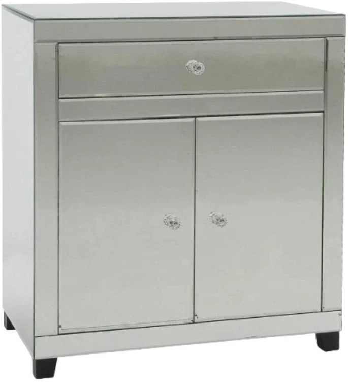 Sleek mirrored cabinet with a top drawer and 2 lower doors with clear acrylic knobs. Solid wood frame with mirror facings. Wood legs in black finish. Make a bold statement by incorporating this cabinet into your home.Read More