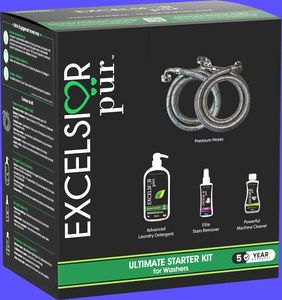 The Excelsior Pür Ultimate Starter Kit provides everything needed for premium laundry performance and long-term washer protection. This all-in-one bundle includes a pair of premium stainless-steel washer hoses, a pair of premium stainless-steel steam dryer hoses, 950 ml 7.5x concentrated laundry detergent (79 loads), 120 ml stain remover, 250 ml machine cleaner, and a water leak detector for added safety. Available in Fresh Scent or Unscented.Read More