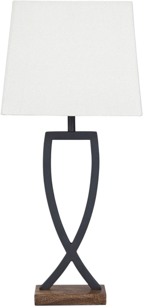 The Makara 2-piece table lamp set features and open design, crisscrossed lines, and rectangular hardback shades for a streamlined look.