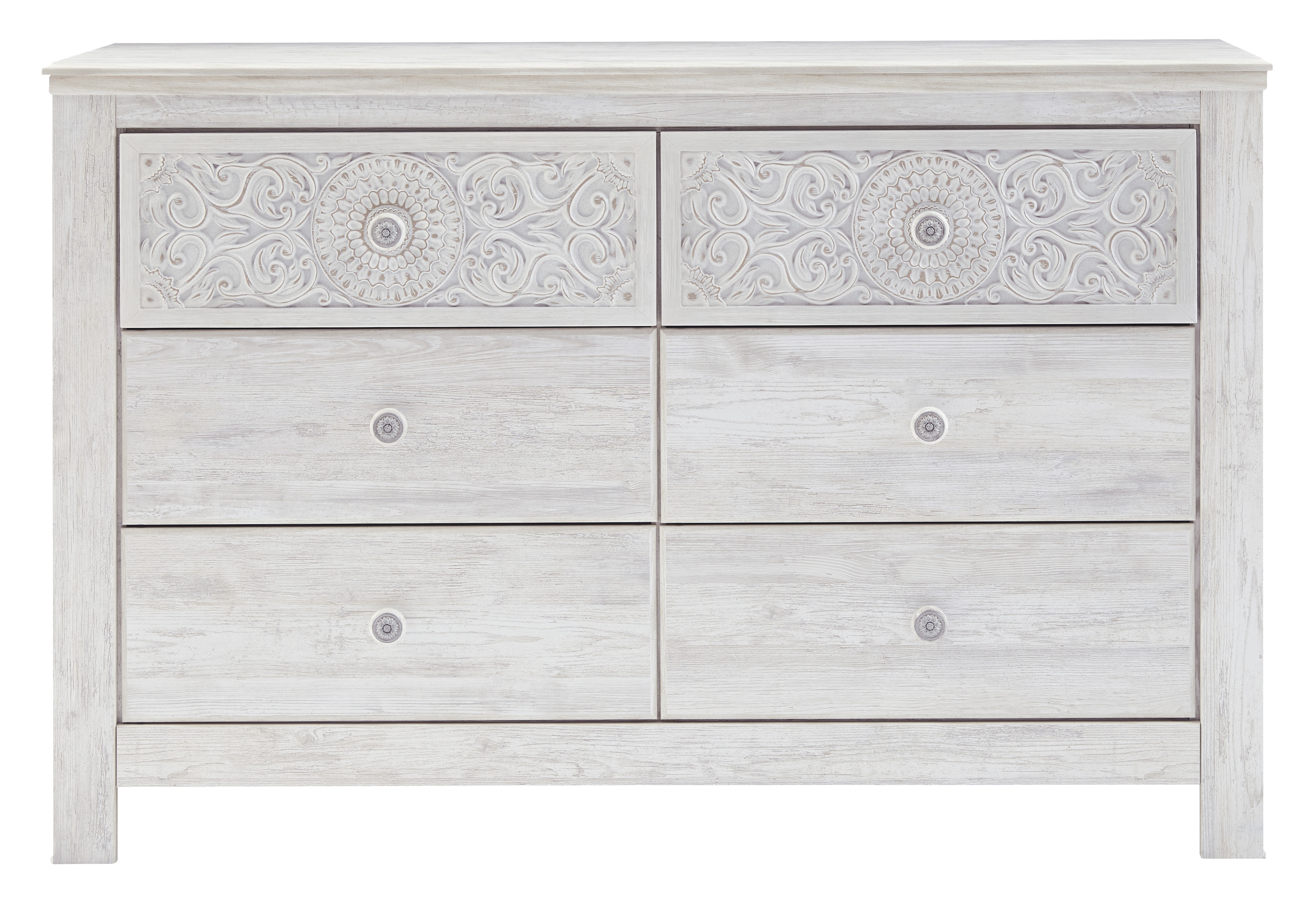 If it’s coastal chic or cottage quaint style you long for, this whitewashed dresser invites you to go to town. Its distinctive weatherworn finish conveys an easy-breezy sensibility, perfect for a restful bedroom retreat. Tastefully edited lines and medallion drawer pulls give this attractively priced dresser a high-end aesthetic. Assembly required for this product.Read More