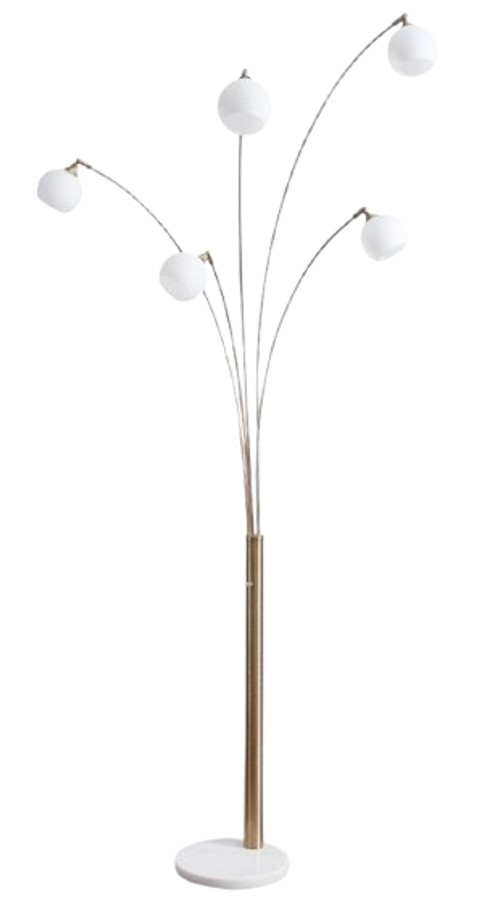 Why settle for ordinary? Feel free to bend the rules with this metal arc floor lamp. Equally sculptural and functional, this striking piece wows with its champagne-colored metal and sturdy white marble construction. Five staggered-height lights with glass globe shades illuminate every which way.Read More