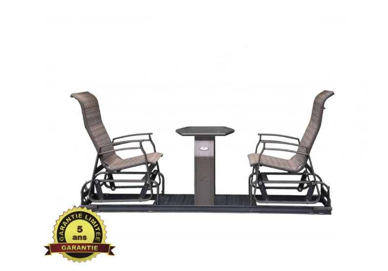 Cette balançoire, aussi appelée la balançoire condo, est composée de 2 fauteuils oscillants 701L à dossiers hauts ergonomiques qui permettent à chaque personne de pouvoir se balancer à son rythme. Elle est idéale pour les petits espaces.En savoir plus