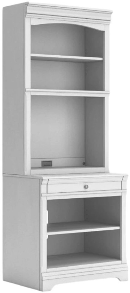 Make a style statement with this home office bookcase. Its traditional design is updated with an on-trend distressed whitewash finish. A hutch with LED underlighting shines a light on those elusive reading glasses and other desktop items. The bookshelf and drawer space add up to a well-organized work area.Read More